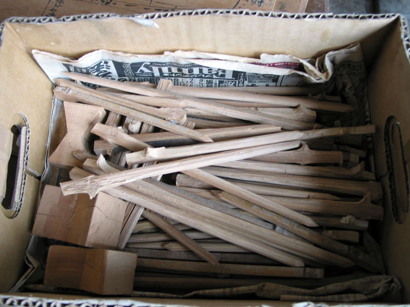 竹釘は竹を割った材を大まかに削って作られました。くぎの頭には継ぎ目(節)が来るようになっています。それぞれは丸く、ほんの少しばかり先細になるように作られています。釘の柄の部分はおおよそ七分ほどの径で八寸の長さです。先端部は一点に尖っているのではなく、鑿のような形になるように樹皮側から斜に切られています。釘を打ち込む際は樹皮側を舷側板に面して並べます。斜に切っているので打ち込まれるときに釘が曲がりやすいと下門さんは言いました。私たちは釘を油に浸けて注意しながら釘穴へとハンマーで叩き込みました。竹釘で杉を貫いて打ち込むわけではないので、釘が道穴の底にきっちりと留まるようによくよく気をつけて打ち込まなければなりません。取り付けられた後、竹釘とフゥンドゥは舷側板と同じ面になる様に鋸で切り落とされます。
